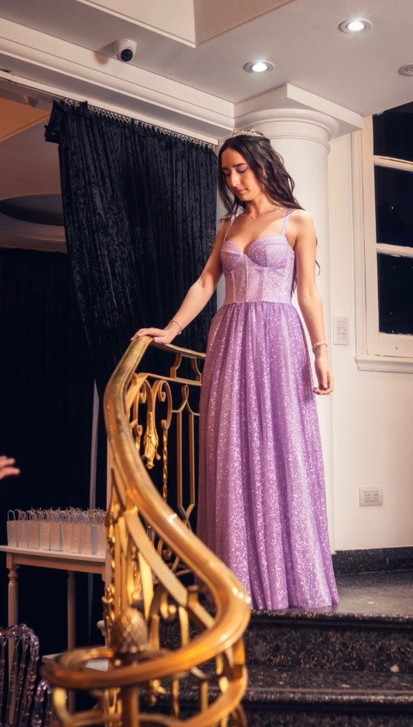 Vestido en tul lila con delicado acabado brillante, que aporta luz y sofisticación. El corset con varillas marcadas y escote en forma de corazón estiliza la silueta, mientras los tirantes finos suman un toque de frescura y comodidad. La falda amplia y fluida completa el diseño, logrando un equilibrio entre modernidad y elegancia ideal para una noche especial.